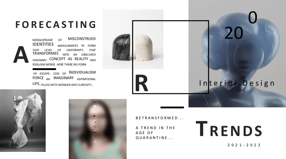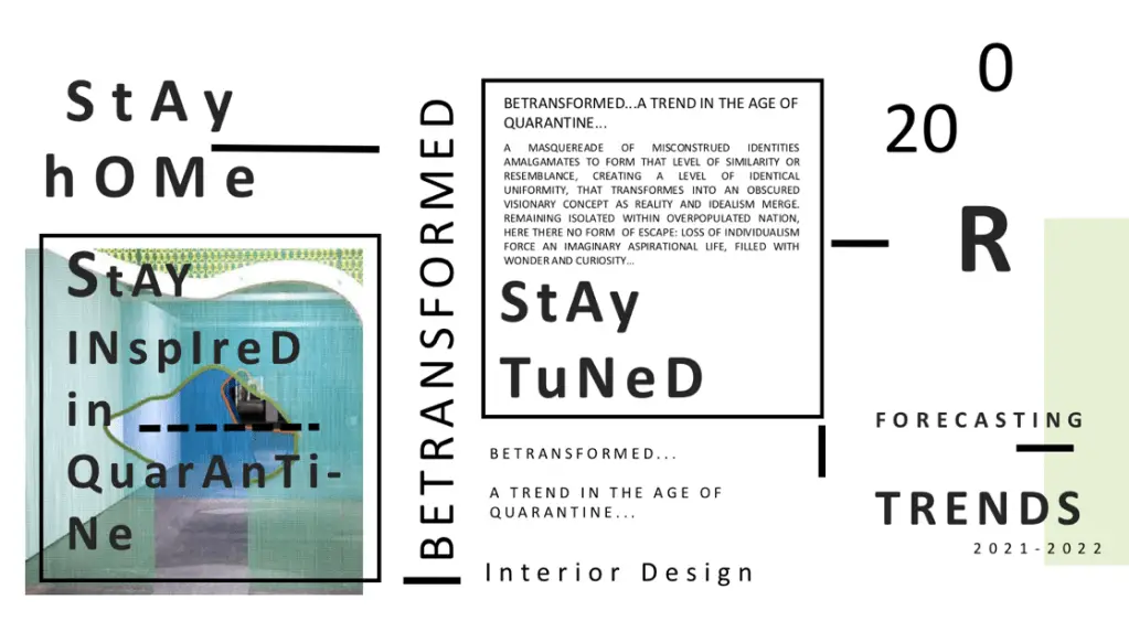 Scoping different models of the design process is an integral part of the educational outcome of this course program documenting forecasting consensus, that are based on foresight typological studies, conceptual researches and art-based visual thinking driven by the motto of “BE TRANSFORMED”. Launching annual Trend books that feature foresight vision and key characteristics of trends spotting techniques and trends boards that were produced through the spring semester of 2020 during the outbreak of COVID-19 and in the age of quarantine.