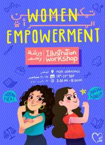 Among the many elements that have offered exquisite success to Sandra’s campaign was using social media platforms – such as Facebook and Instagram – for spreading the word about it and showcasing the participants’ artworks. In Sandra’s early planning, the final target was to create an online exhibition of all the artworks created for this campaign. The campaign was immediately met with unalloyed enthusiasm from artists and audience alike. And as a consequence, news about the uprising virtual social movement spread like light, which has caught the attention of the women empowerment “You Are More Important” community organisation created by the ‘Misr Foundation for Health and Sustainable Development’, and this is what has given birth to “Women Empowerment” workshop which Sandra co-hosted with fellow visual artist Noran Fikri.