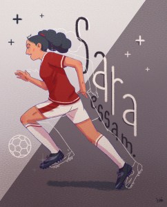 Sandra kicked off the campaign herself by creating a celebratory long-shot illustration of the International Egyptian footballer Sarah Essam, and an influx of participatory artworks started to flood in, submitted by both men and women visual artists. The artworks screamed in diversity from a collage of rural women baking in a composition of vivid hues and arrangement, to visual odes – both analogue and digital – to numerous notable personas in Egyptian society of every field possible. “Social media includes multiple trends of little to no importance, so why not use it for a good purpose?” Sandra said.