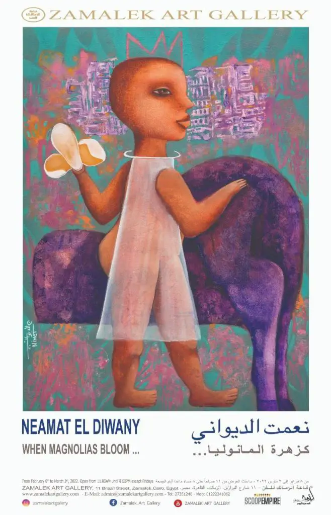 “When Magnolias Bloom” is Neamat El Diwany’s fifth solo exhibition, alongside several collective exhibitions she held in Egypt and abroad.