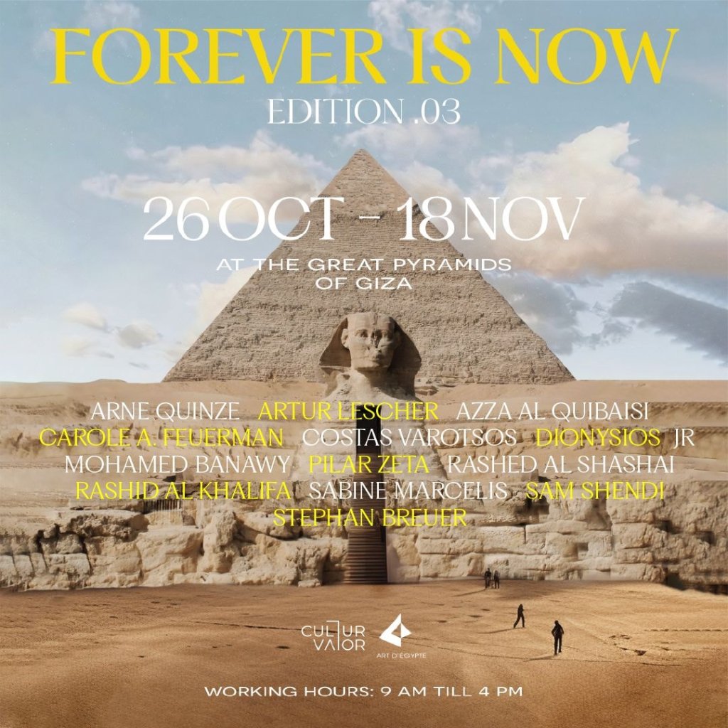 Launched by Nadine Abdel Ghaffar in 2021, Forever Is Now remains the first and only exhibition of contemporary art to take place at the 4500-year-old UNESCO World Heritage site of the Pyramids of Giza and its surrounding plateau. It aims to bring together artists from around world to reflect on the enduring legacy of one of humanity’s most compelling and mysterious structures. Through the lens of these artists’ interests and practices, Forever is Now aims to trace the continuity of themes that stretch from our ancient past to present day whilst paying homage to the ingenuity and reflections of human civilization and art.